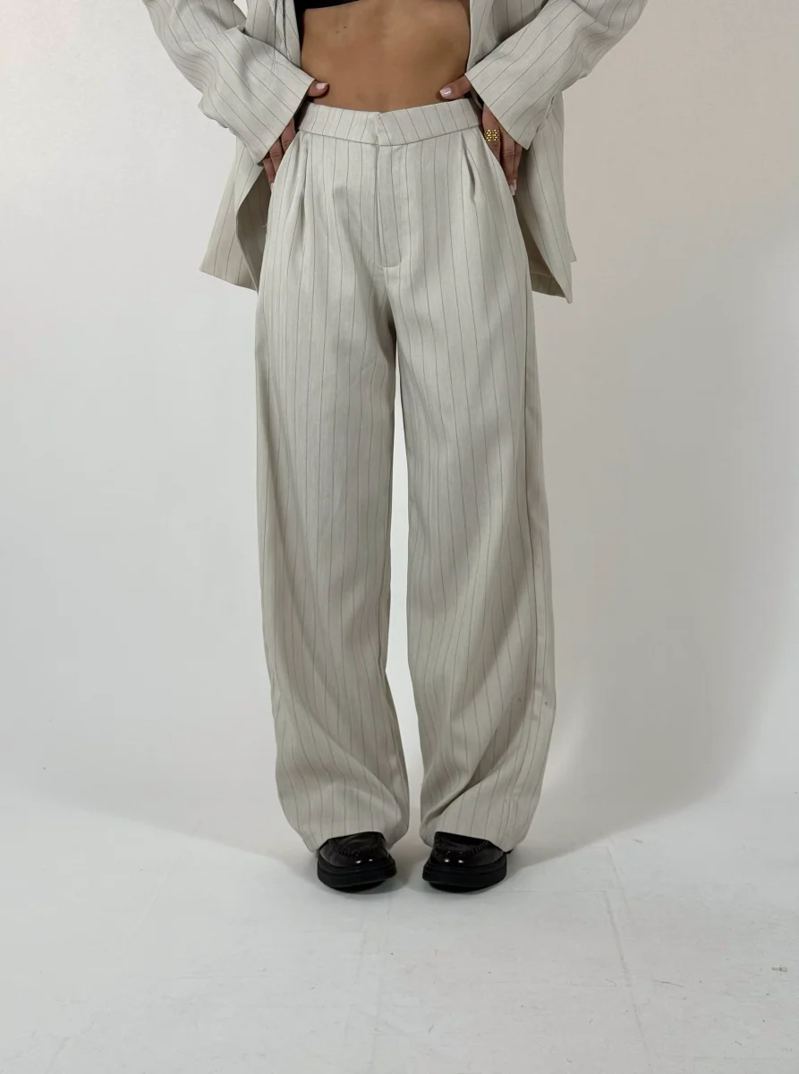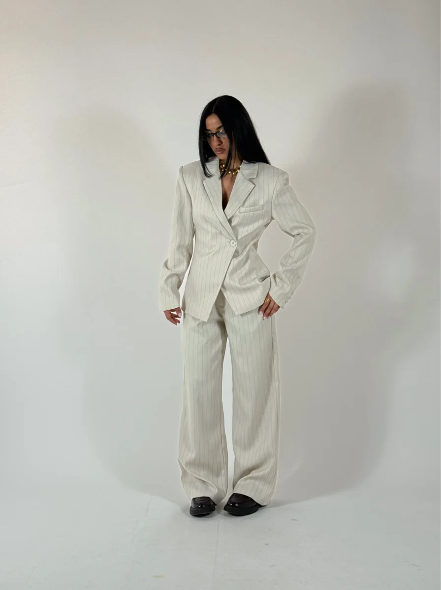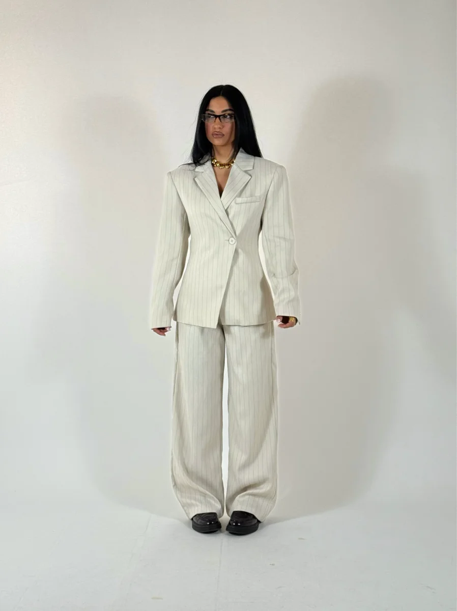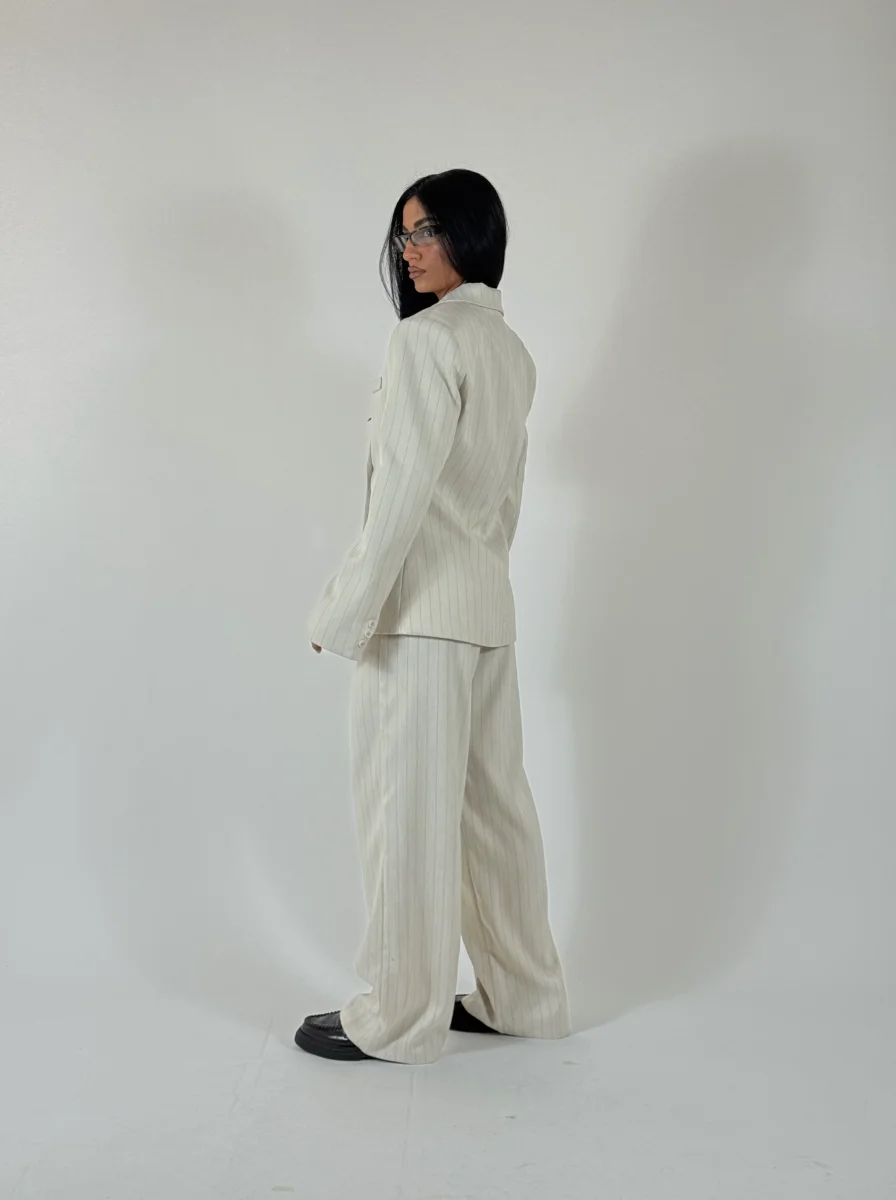 Tailleur gessato composto da giacca strutturata doppiopetto e pantaloni palazzo, vestibilitร  regolare, consigliata fino a taglia 44/46.