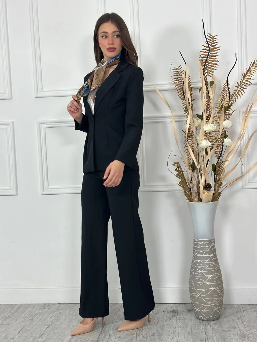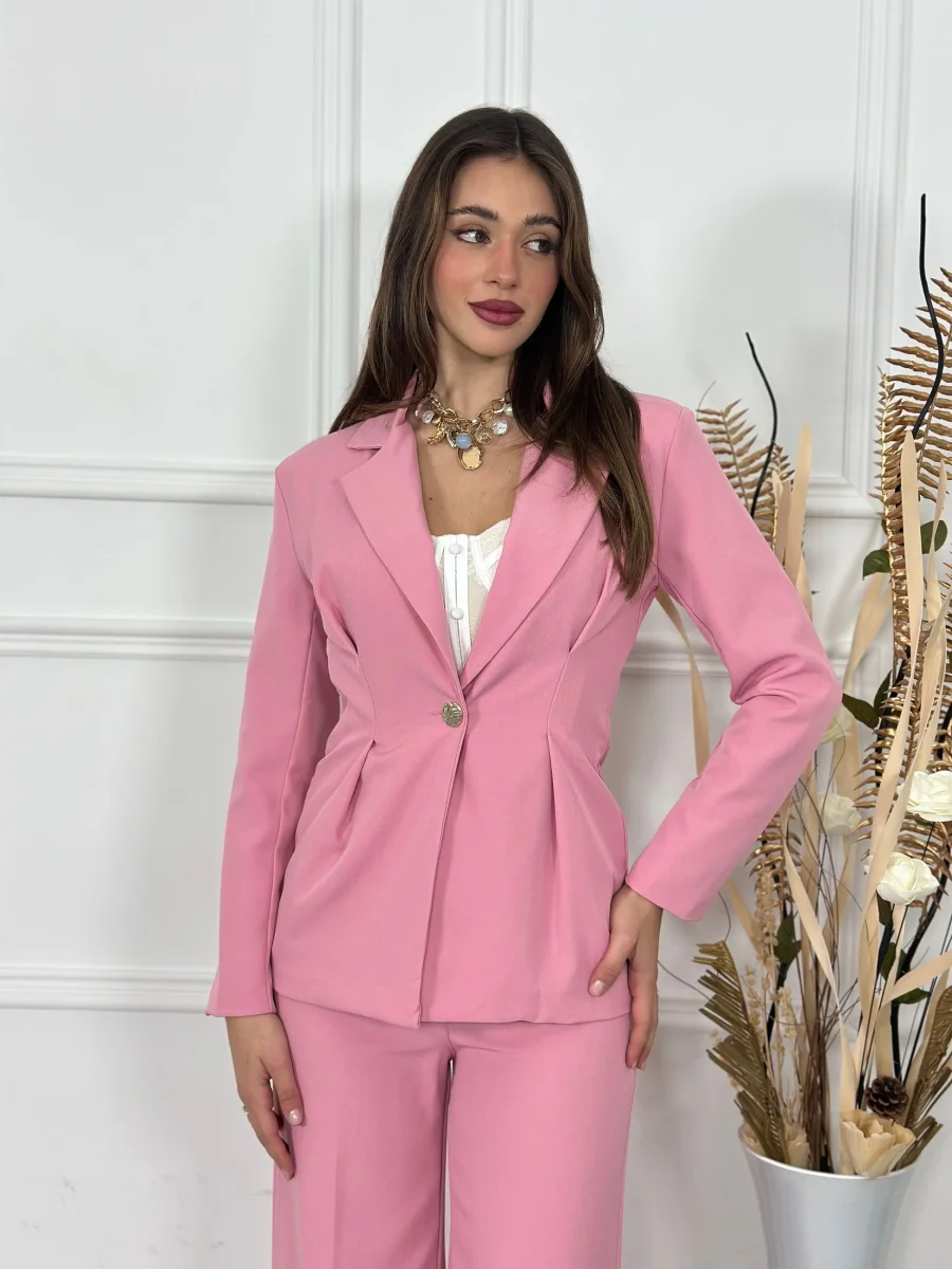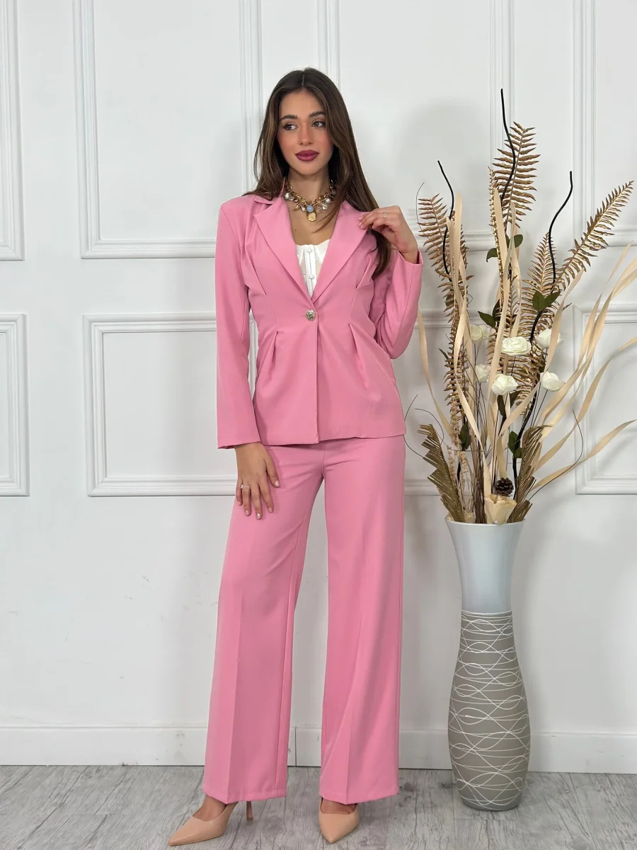 Tailleur composto da giacca foderata avvitata con pence e pantalone a palazzo con elastico in vita