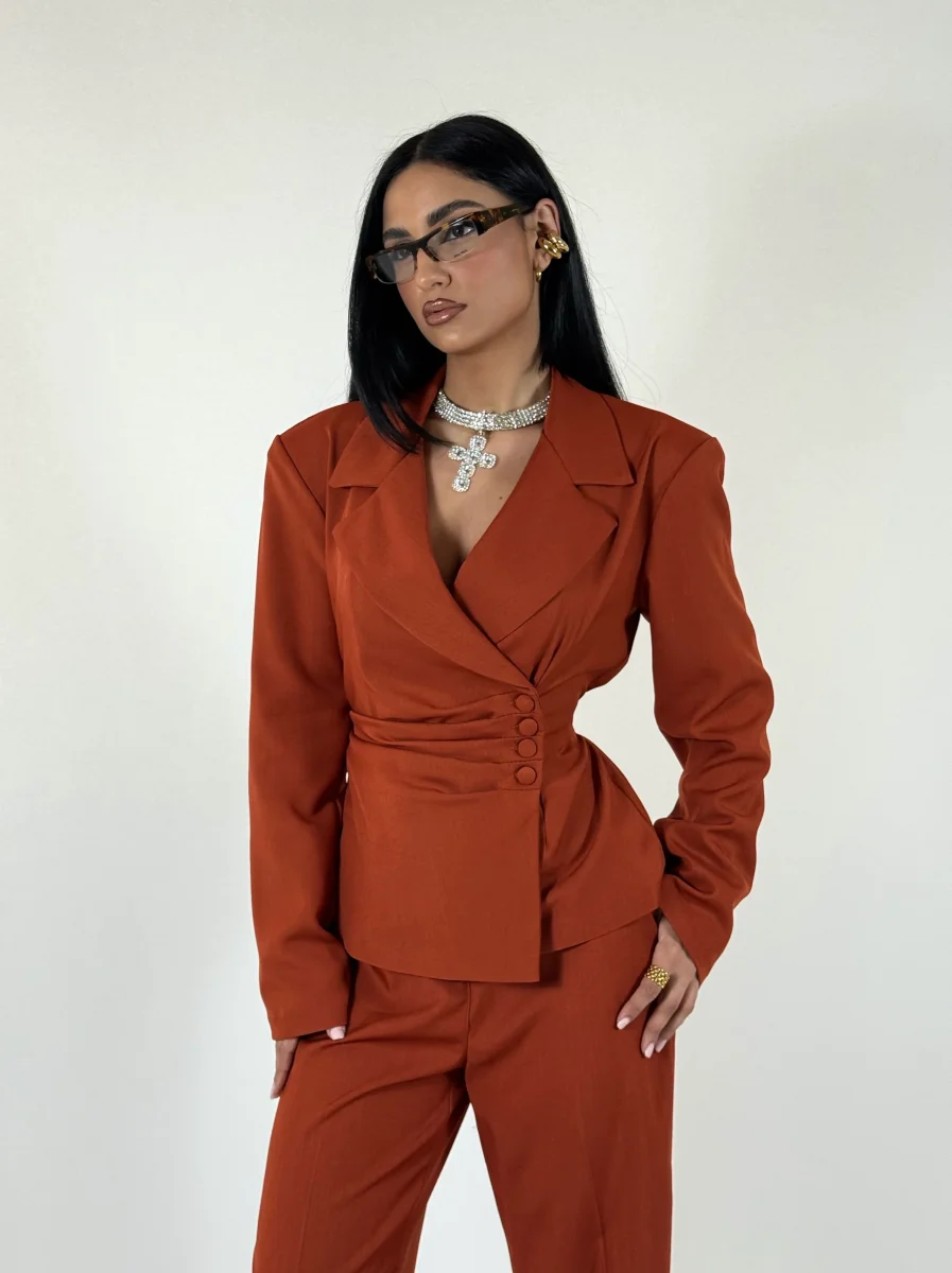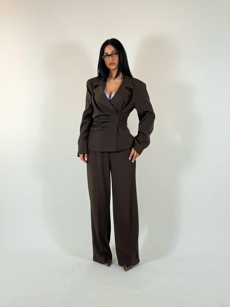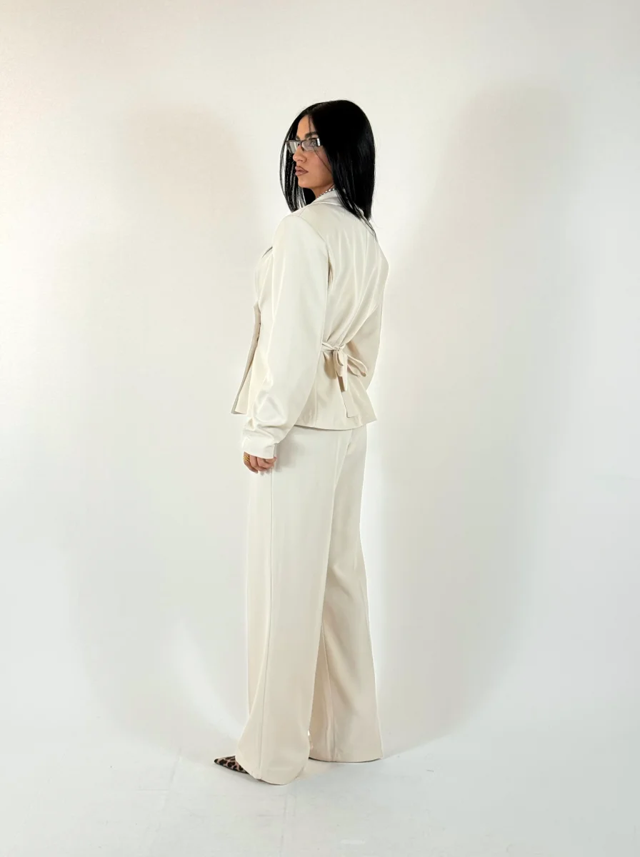 Tailleur composto da giacca doppiopetto con dettaglio drappeggi e bottoni rifiniti nello stesso tessuto e fiocco regolabile sul retro per definire la silhouette, pantaloni dritti con elastico sul retro, vestibilitร consigliata fino a taglia 44.