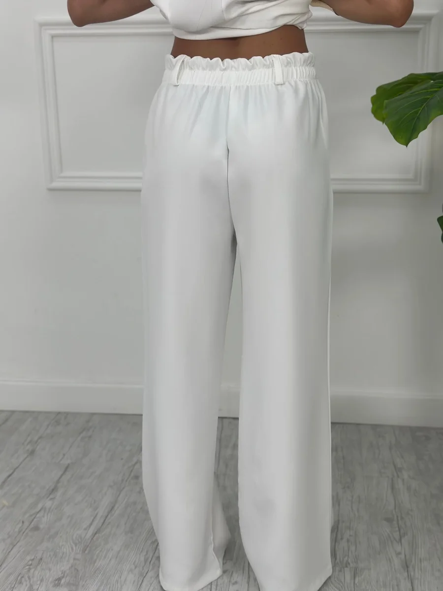 Tailleur composto da giacca smanicata doppio petto e pantalone a palazzo con bottone ed elastico sul retro