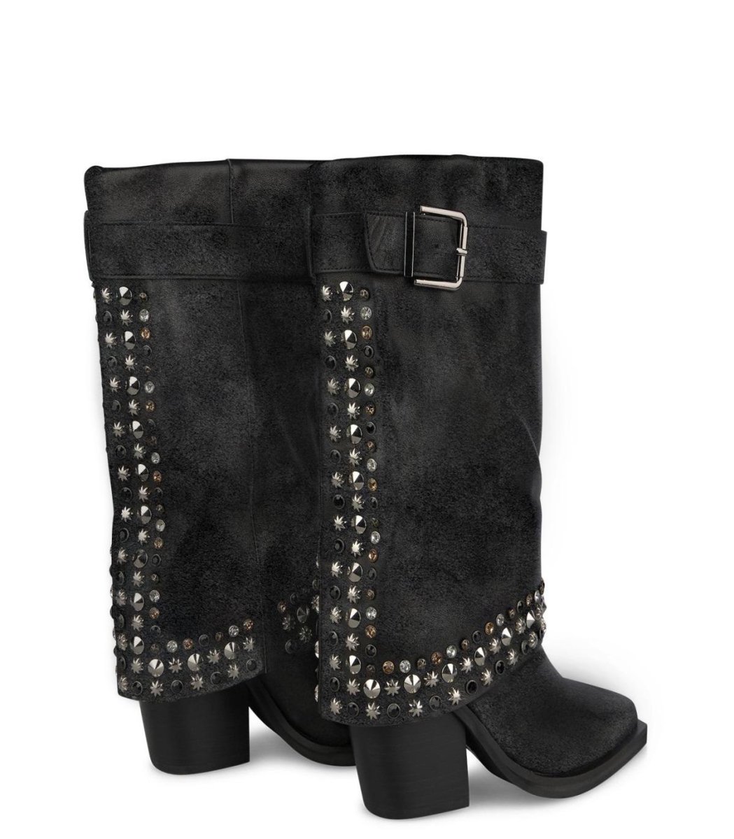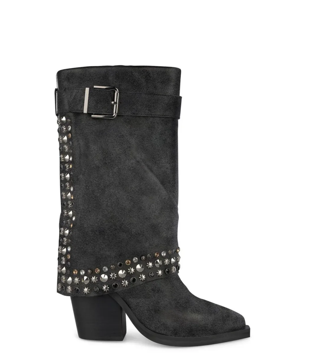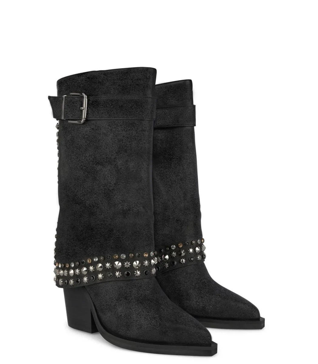 Stivale texano camperos a punta in pelle scamosciata e risvolto con microborchie e strass multicolor. Fondo gomma antiscivolo.