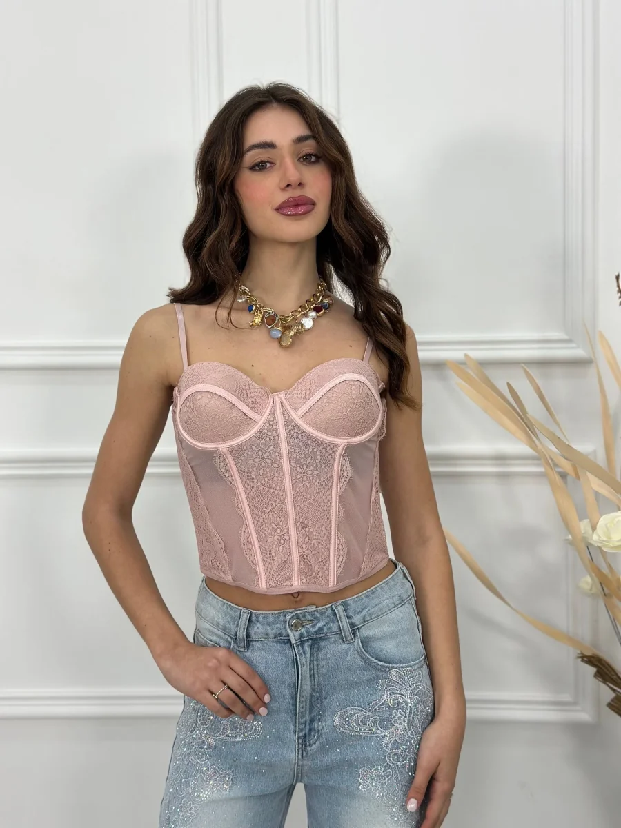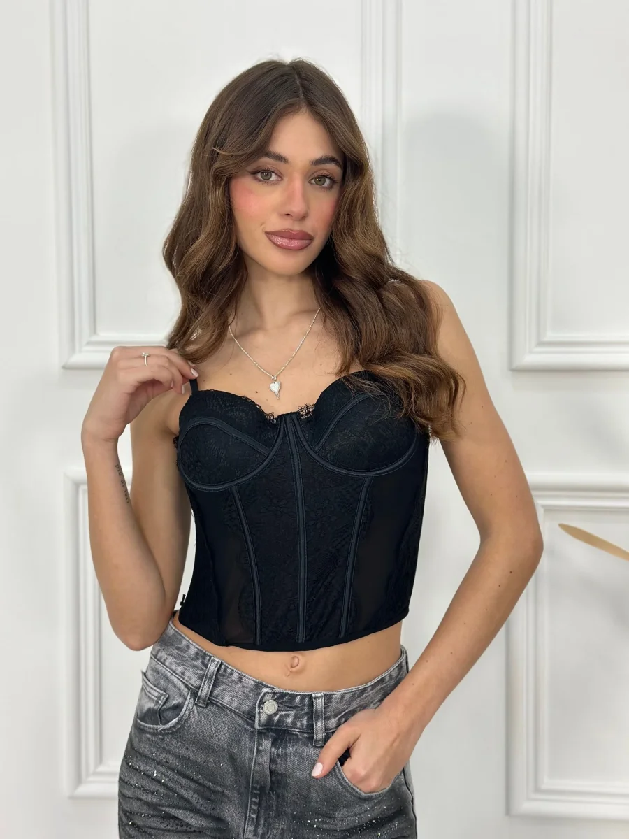 Top Bustier in tulle e pizzo con ciappe regolabili sul retro
