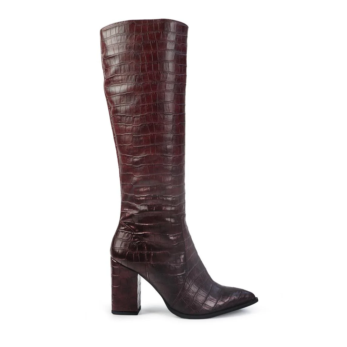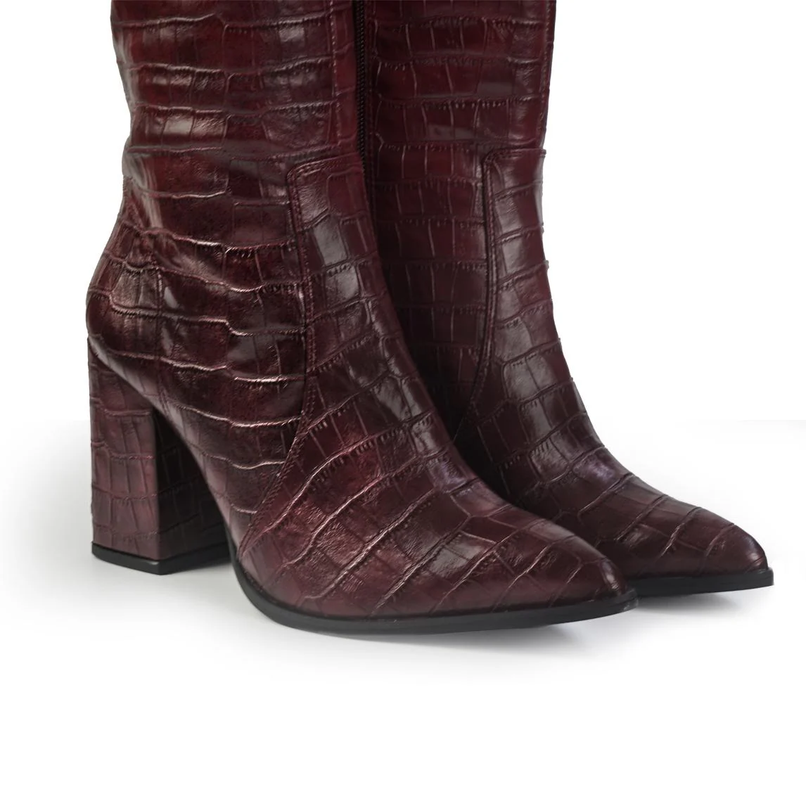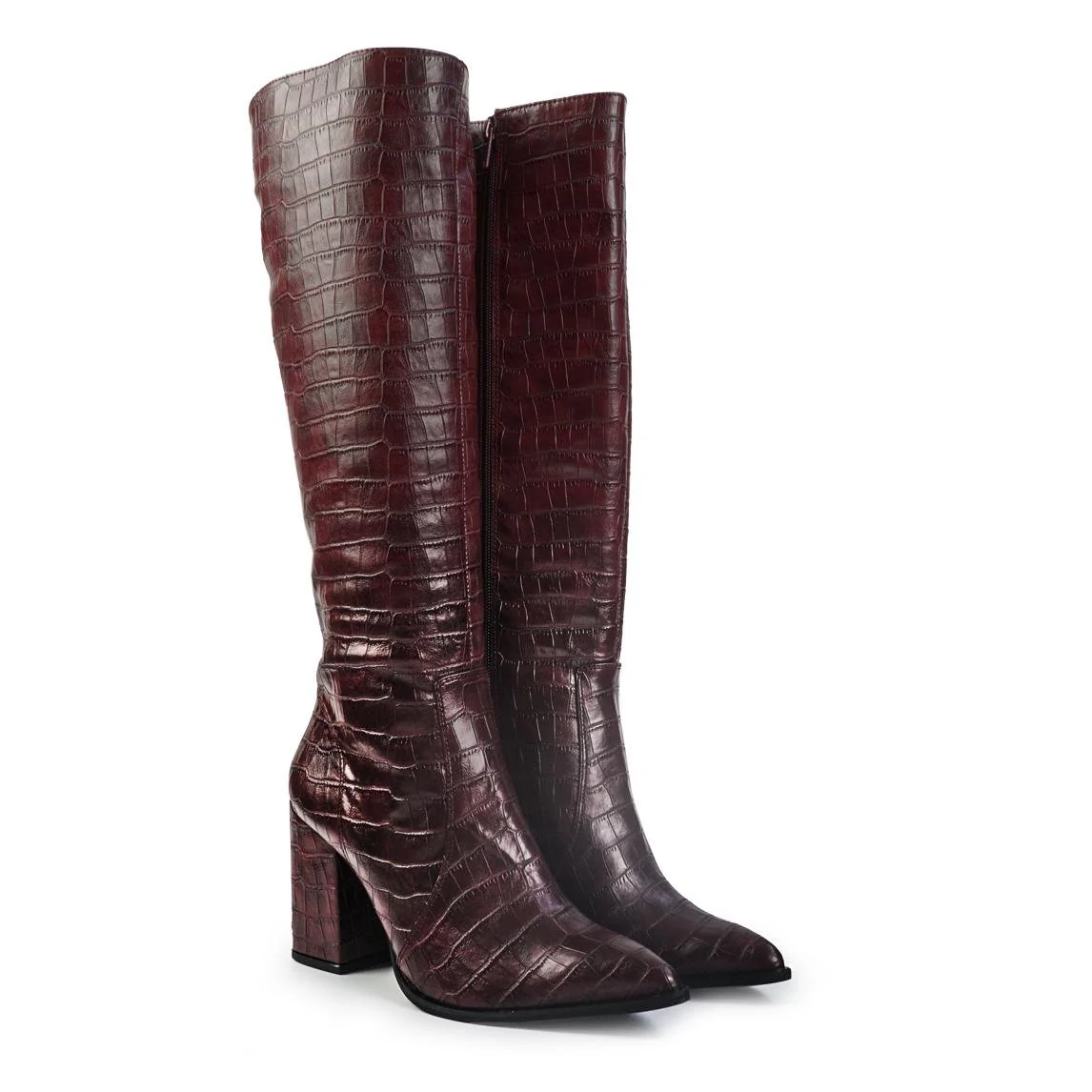 Fai del colore bordeaux il tuo statement di stagione. Questi stivali si distinguono per la lussuosa stampa effetto coccodrillo in vera pelle, che aggiunge una texture ricca e sofisticata. Con il loro tacco slanciato (8 cm) e la linea a punta affusolata, sono l’ideale per trasformare un outfit da giorno o per dominare la scena nelle serate piรน importanti.
