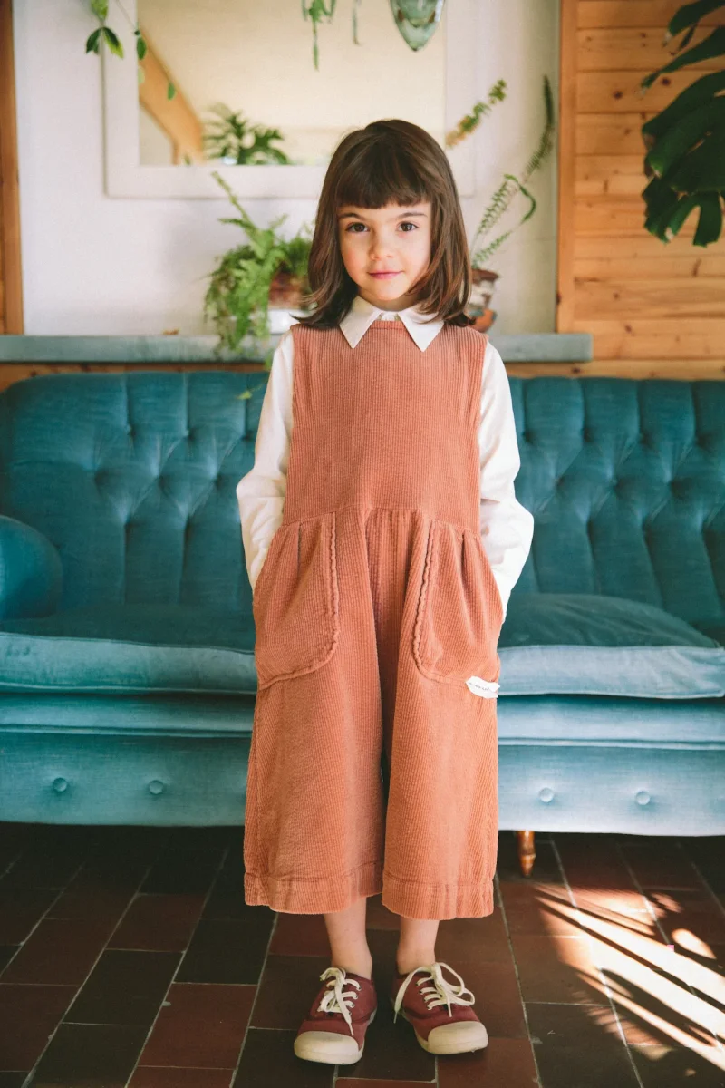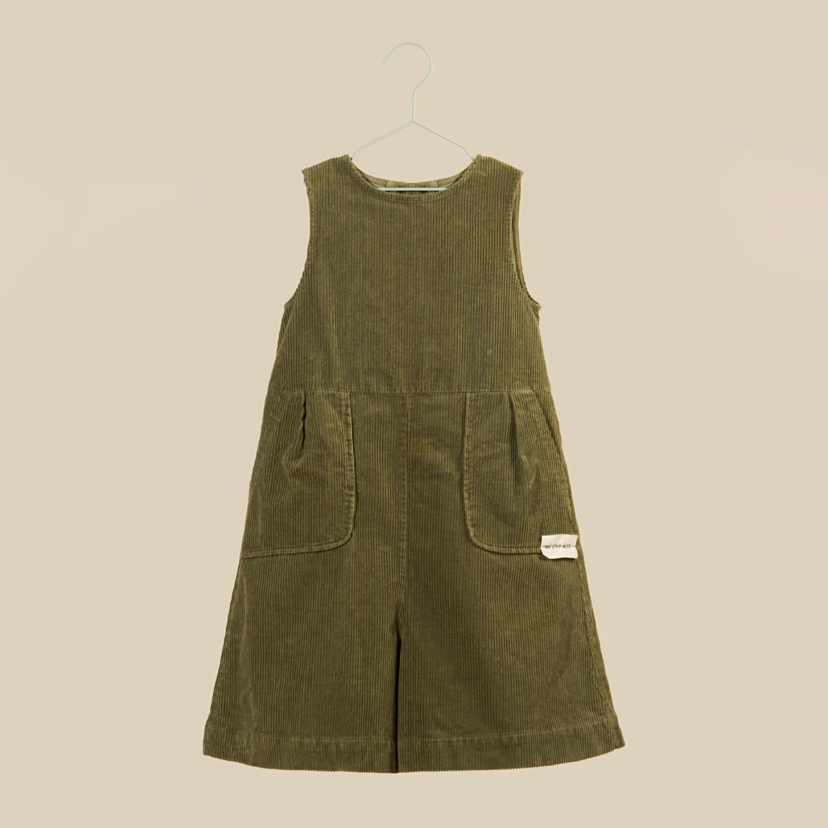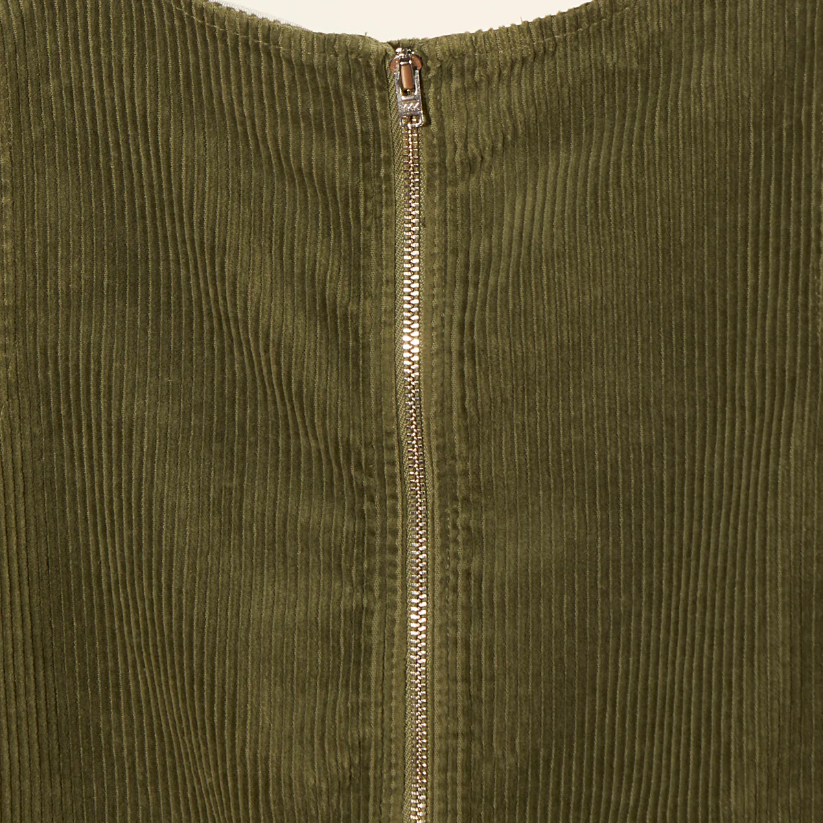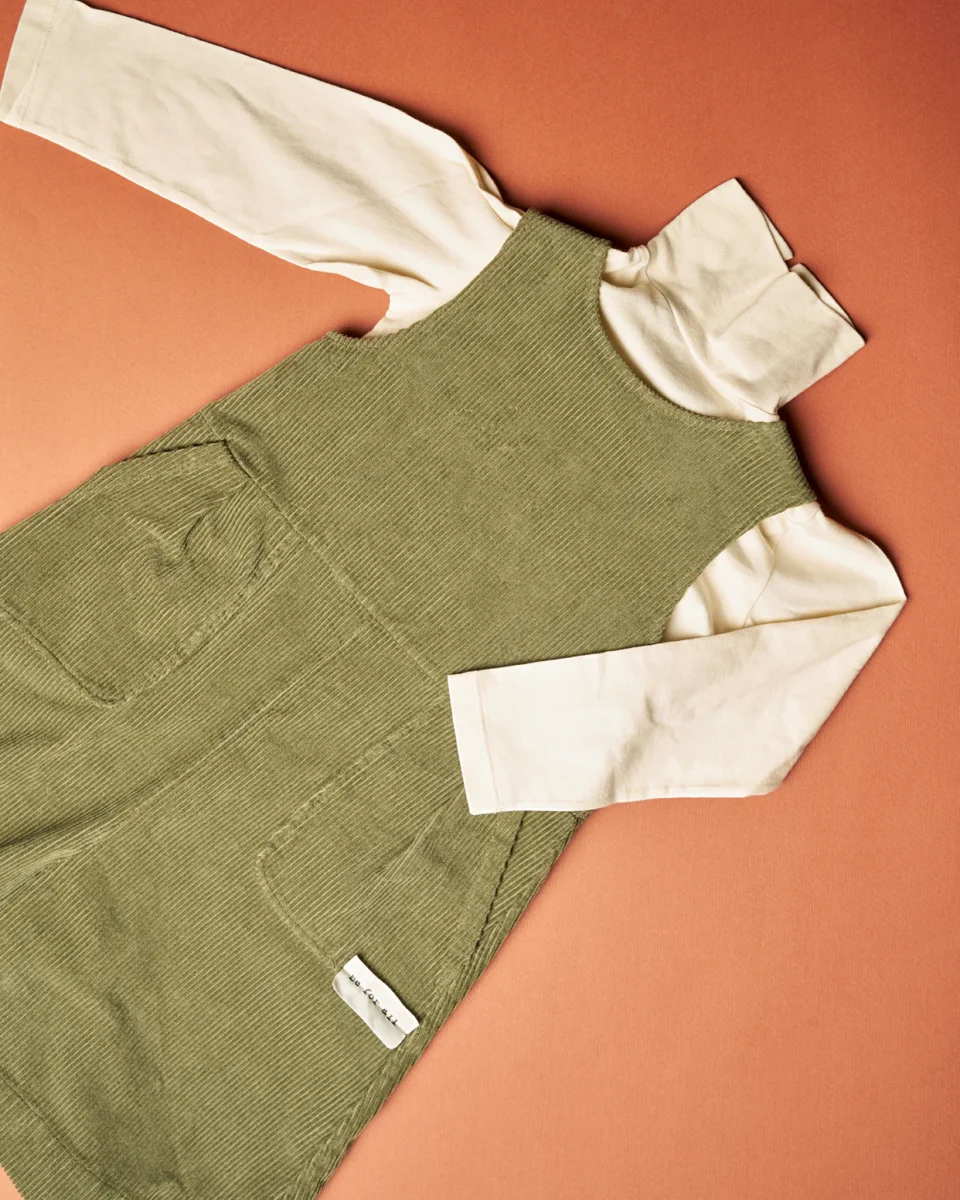 Tuta ampia smanicata in velluto verde a costine. Si chiude con una pratica zip sul retro