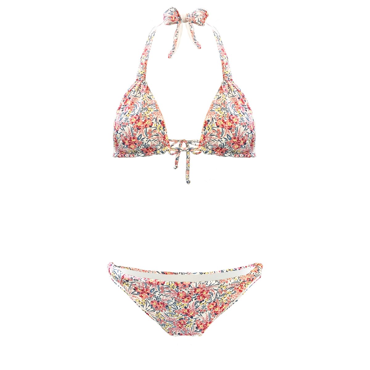 Costume triangolo con imbottitura removibile e cursori per regolare la coprenza del triangolo. I cursori, sia sul fronte che sul retro dello slip, permettono di regolare la vestibilitร , rendendolo da slip regular a slip brasiliano. Il tessuto stampato ricorda le fantasie in stile Liberty con tanti fiori colorati.